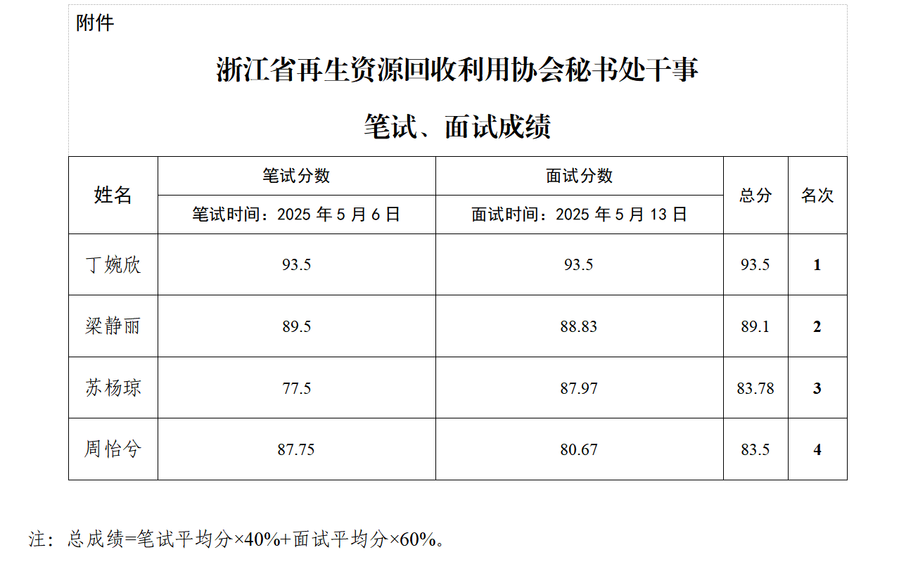 浙江省再生资源回收利用协会于2025年5月6日、5月13日分别进行了秘书处干事笔试、面试。总成绩由笔试和面试两部分按比例合成,笔试占40%、面试占60%。现将成绩予以公示。